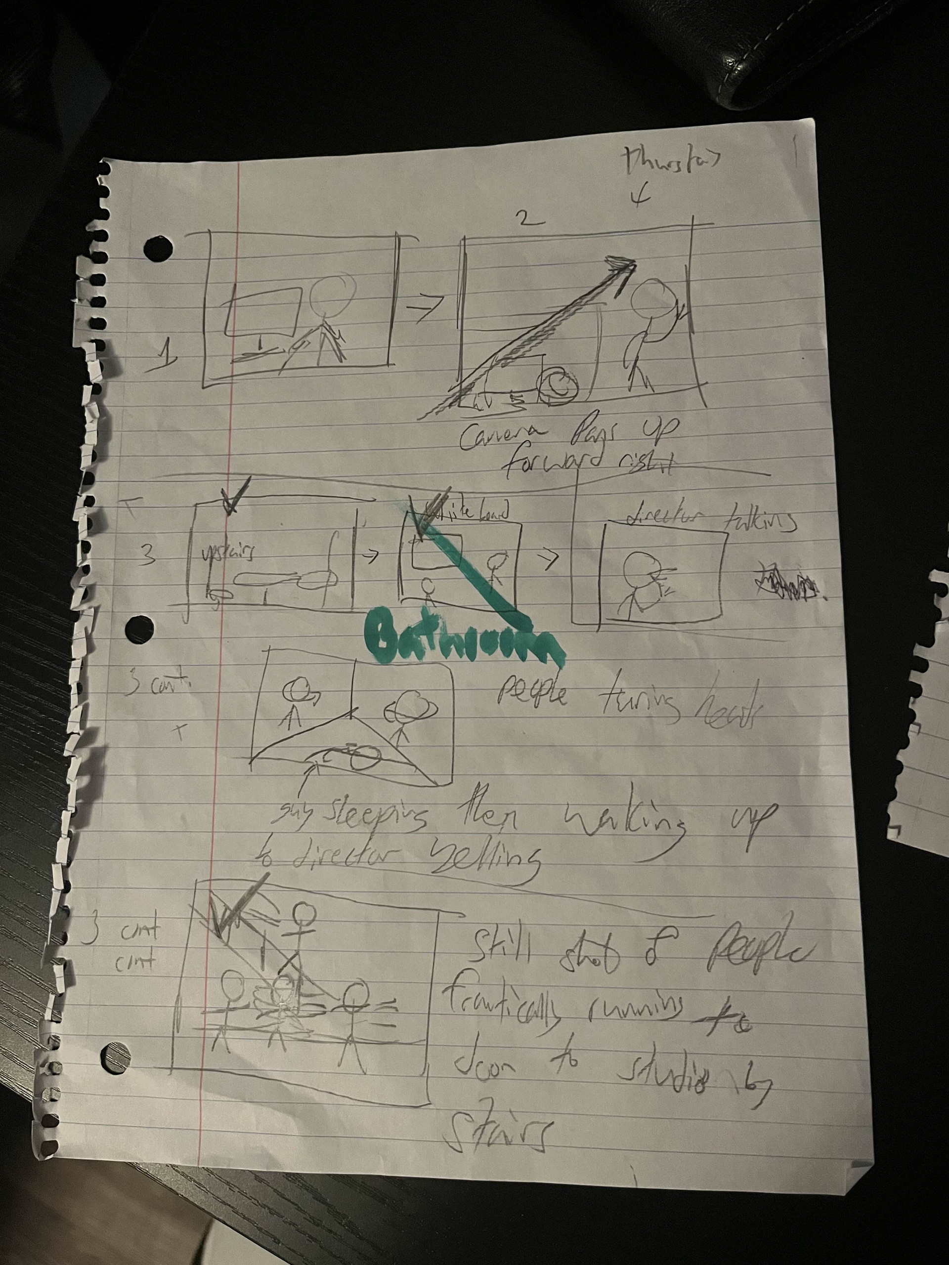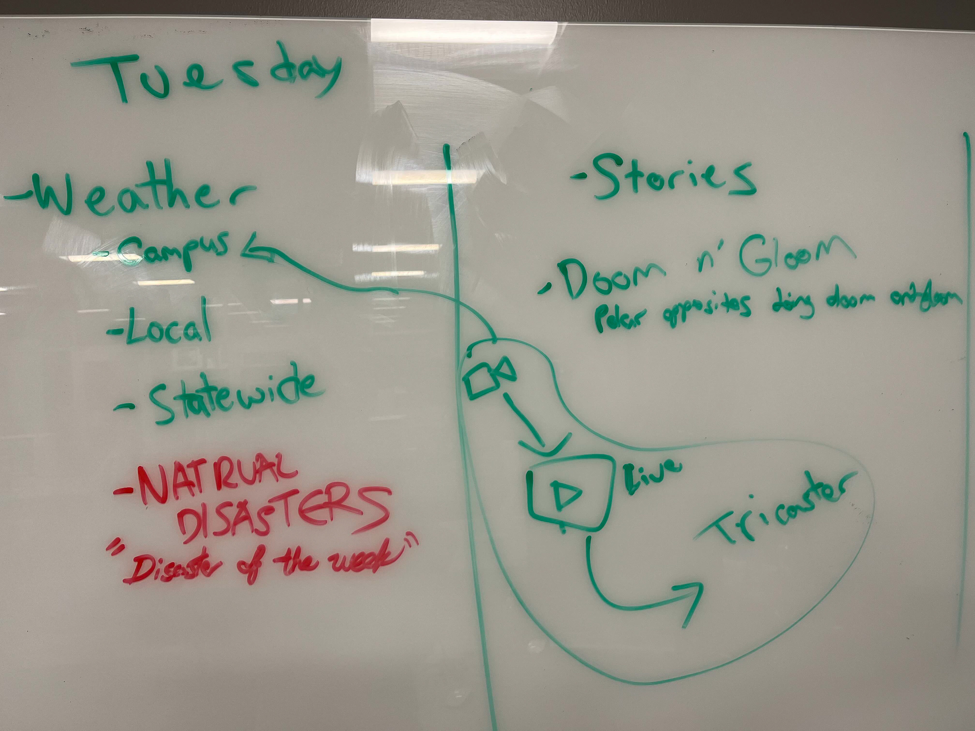 After settling on a name for our series we needed to direct an opening sequence. That was my job. Over 2 hours worth of time I story boarded, directed, and wrote down editing instructions for this intro, as well as brainstormed ideas for our news segment the following week. Below are the links of which I was in charge of being behind the desk and directing. Throughout this class I fulfilled many roles other than direction, I operated mixer boards, cameras, I was tech direction & an actor ;)